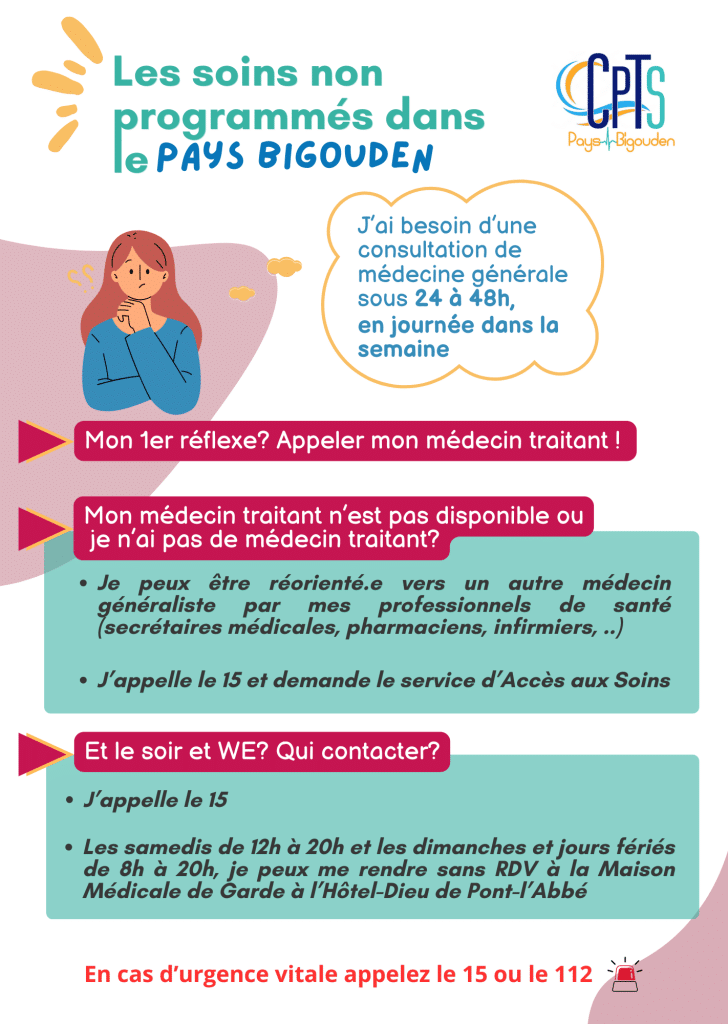 La CPTS du Pays Bigouden met en place depuis mi-novembre 2023 une organisation sur les Soins Non Programmés (soins qui ne relèvent pas des urgences mais qui doivent être pris en charge dans les 24h – 48h).