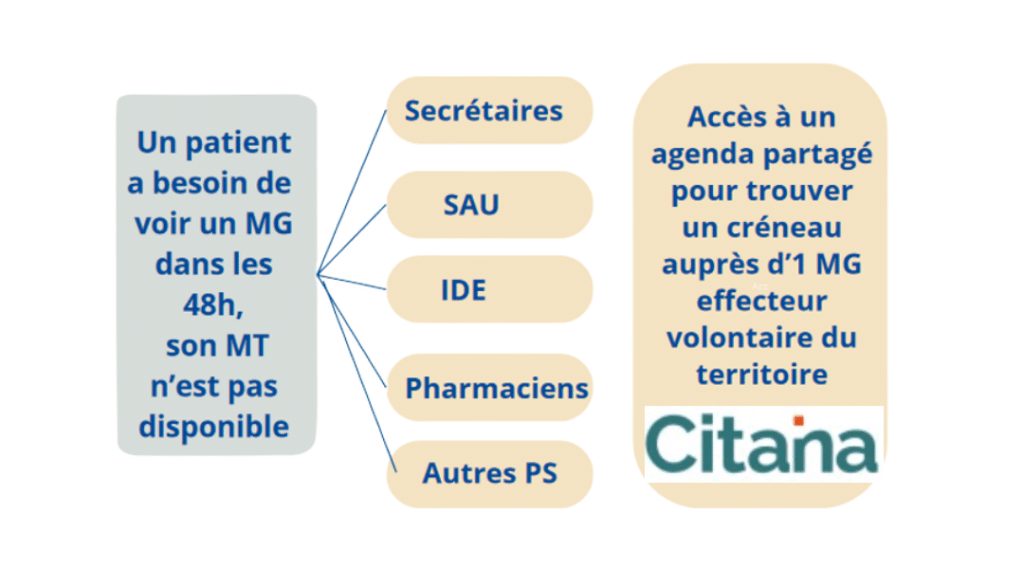 - Cet agenda est accessible à différents professionnels du territoire (secrétaires médicales, Service d’Accueil des Urgences, IDE, Pharmaciens et autres professionnels – kinés, …) qui peuvent ainsi orienter les patients dont le médecin traitant n’est pas disponible vers les créneaux SNP de la CPTS