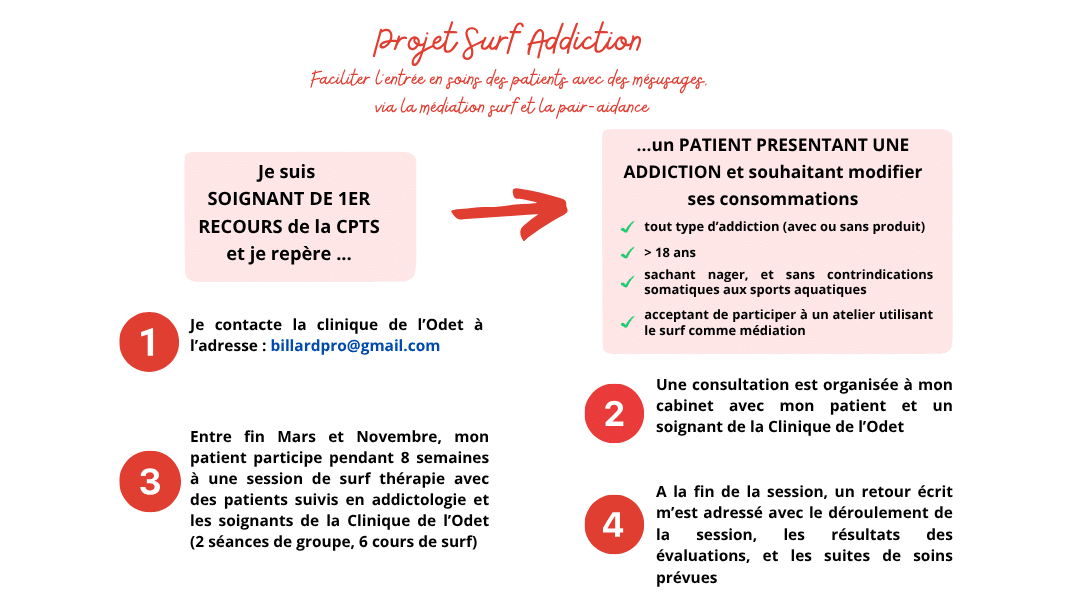 Depuis 2024, les professionnels de santé de la CPTS peuvent orienter leurs patients présentant des addictions vers les sessions de surf avec des patients suivis pour addiction à la Clinique de l’Odet, dans un objectif de pair-aidance et afin de faciliter l’entrée dans les structures de soin.